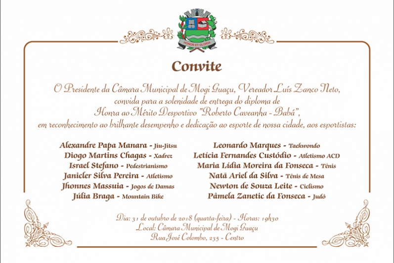 O Presidente da Câmara Municipal de Mogi Guaçu, Vereador Luís Zanco Neto, convida para a solenidade de entrega do diploma de Honra ao Mérito Desportivo “Roberto Caveanha – Babá”, em reconhecimento ao brilhante desempenho e dedicação ao esporte de nossa cidade, aos esportistas: