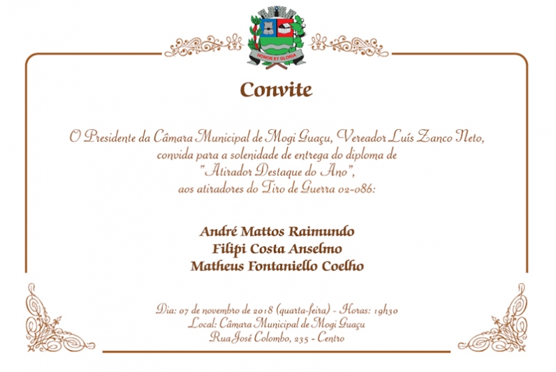 O Presidente da Câmara Municipal de Mogi Guaçu, Vereador Luís Zanco Neto, convida para a solenidade de entrega do diploma de “Atirador Destaque do Ano”, aos atiradores do Tiro de Guerra 02-086: